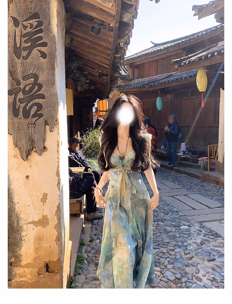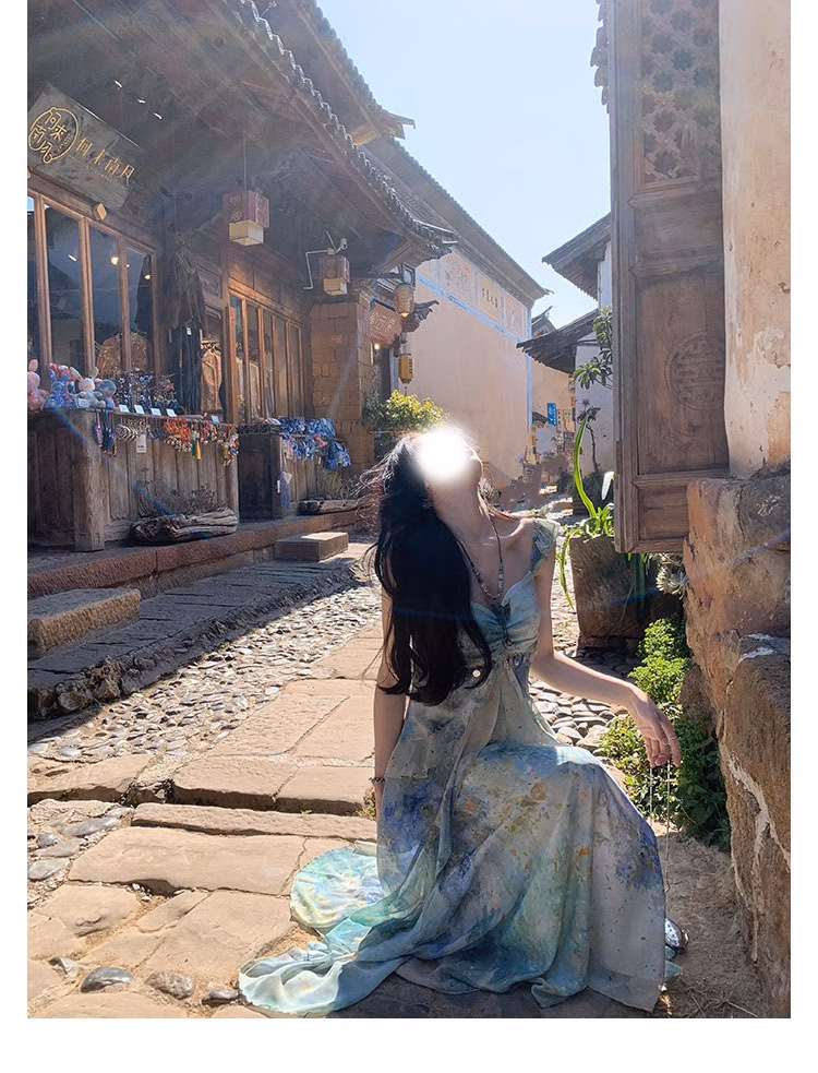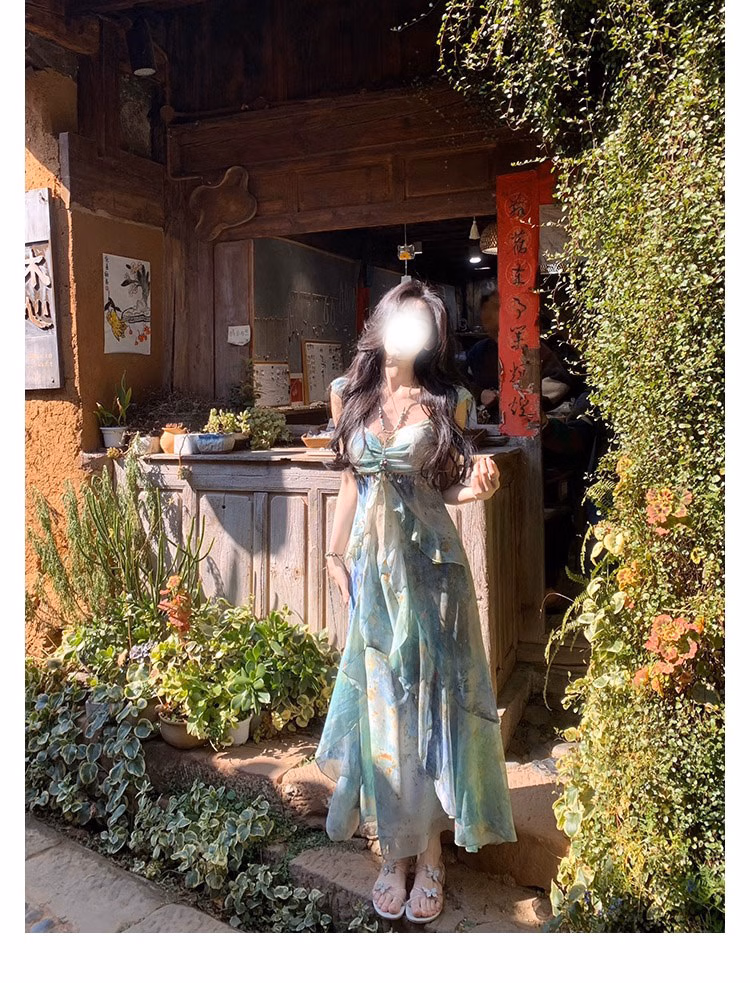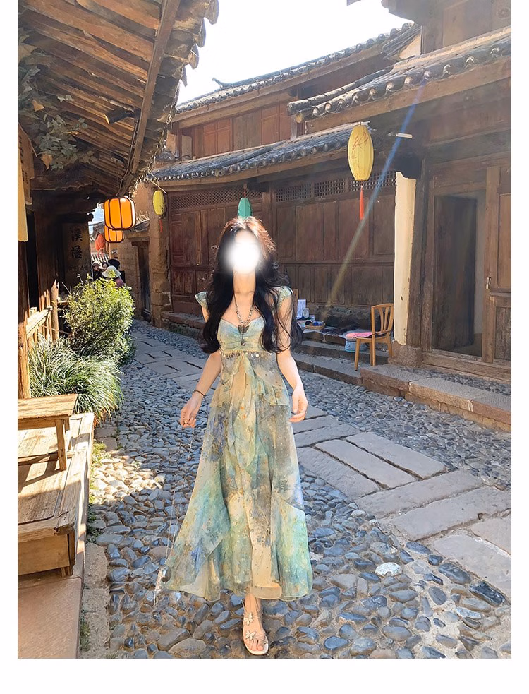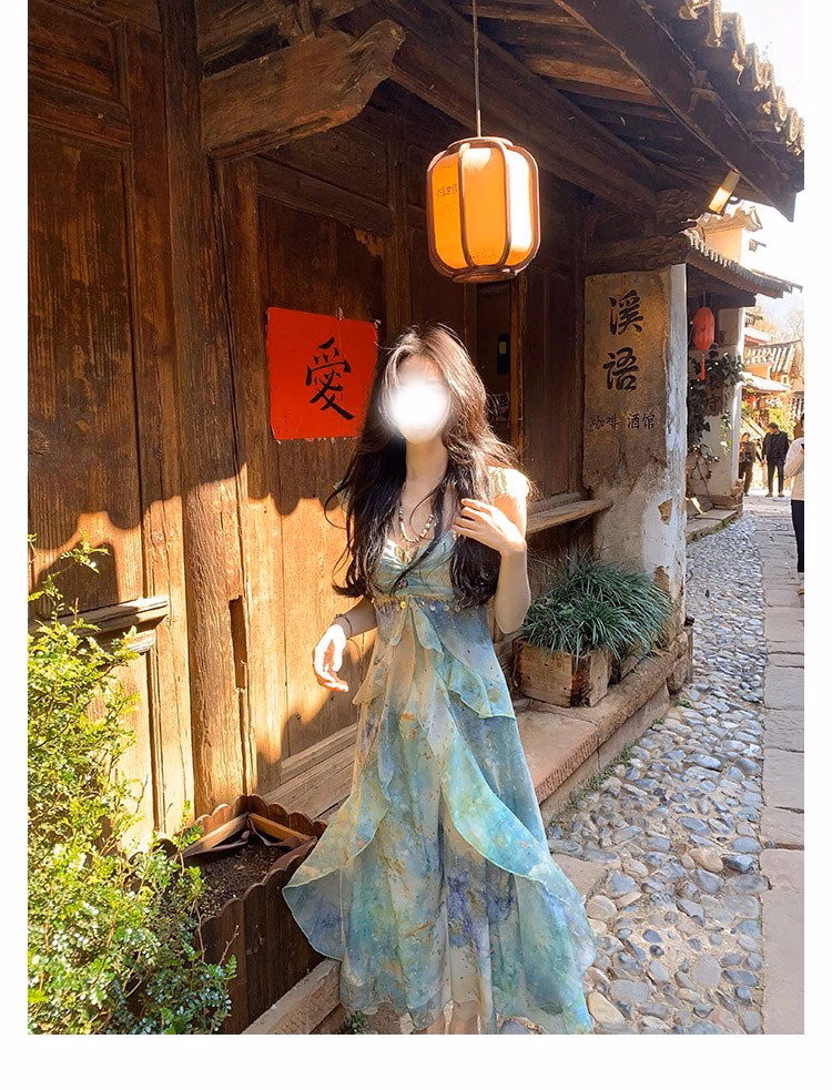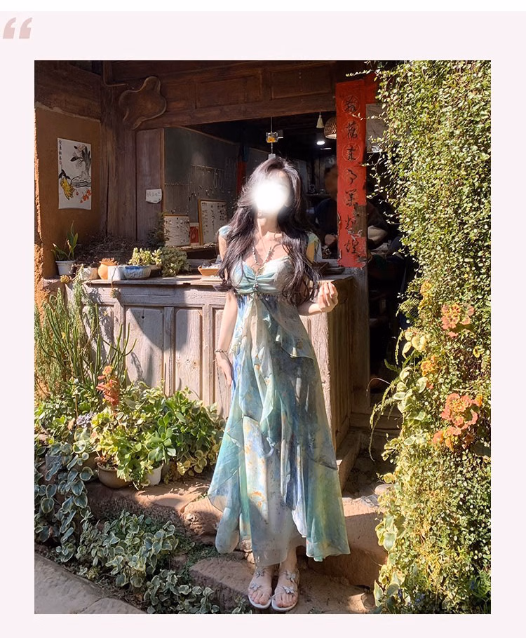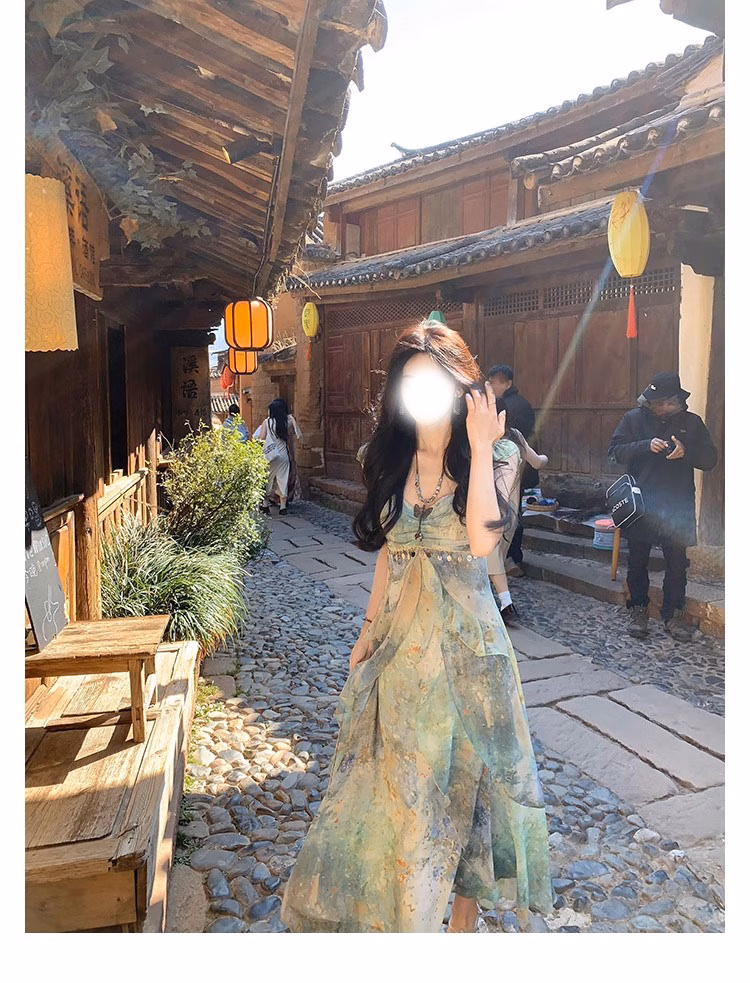 心楠 吊带气质连衣裙女2025年夏季新款印花显瘦收腰长裙子女海滩云南 有胸垫【m】适合95-105斤
