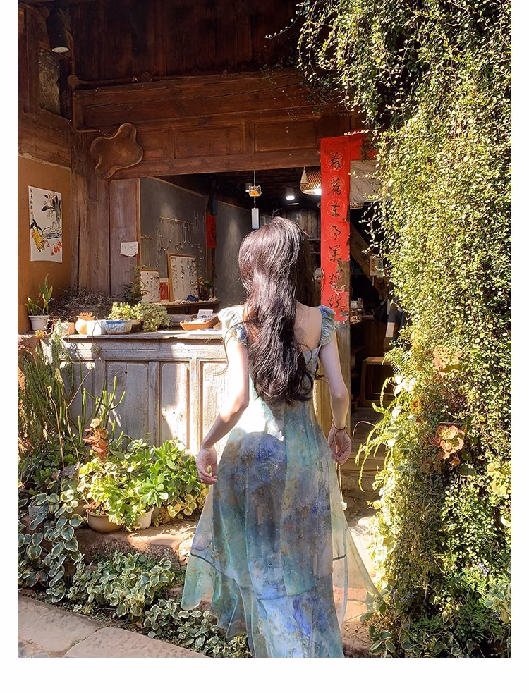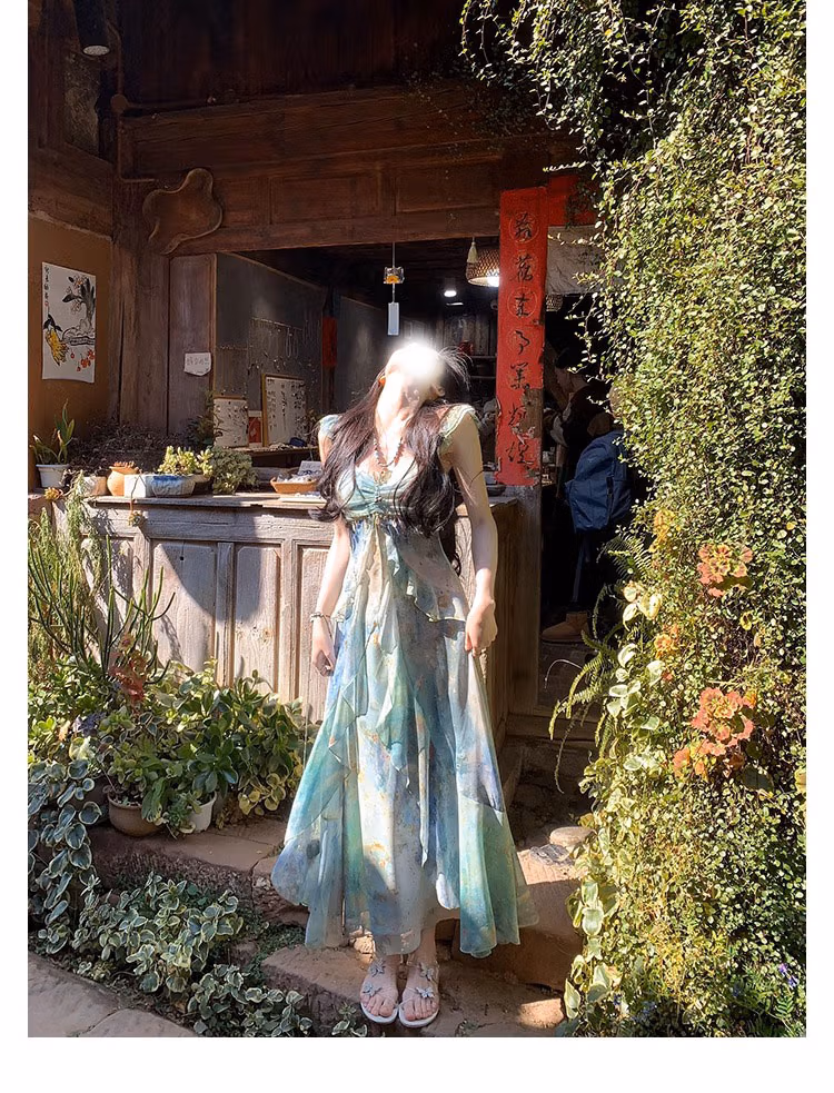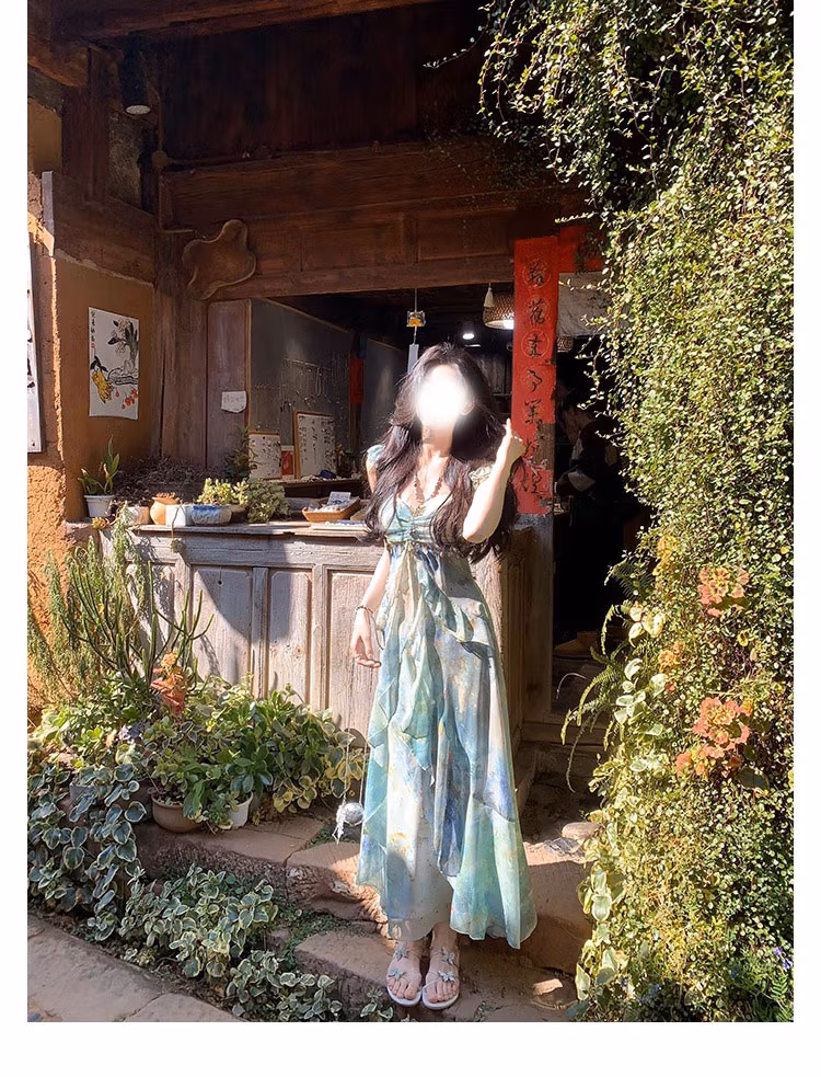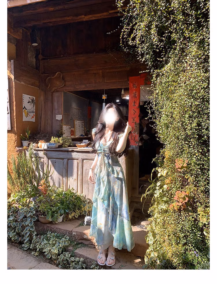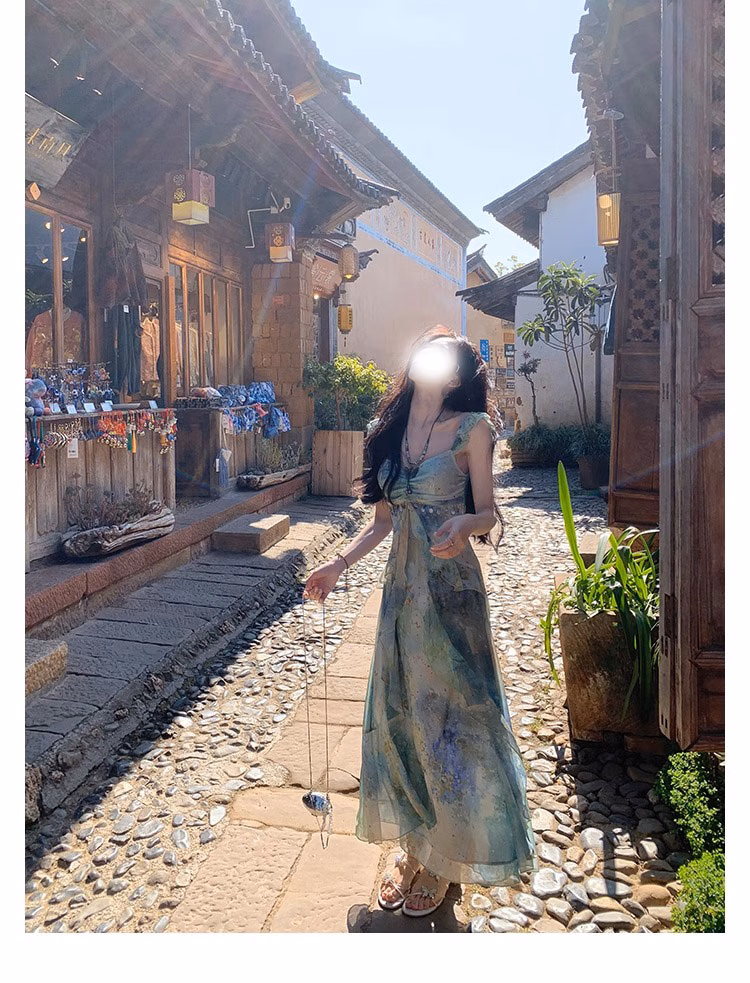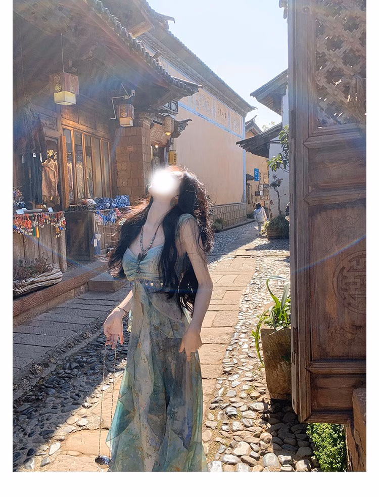 心楠 吊带气质连衣裙女2025年夏季新款印花显瘦收腰长裙子女海滩云南 有胸垫【m】适合95-105斤